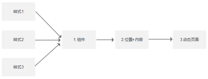 可以把页面的动态配置比作乐高玩具,每一个组件就像乐高积木,可以用它搭建不同的乐高玩具,就类似组装成不同的动态页面。我将页面的动态配置分为3步:组件→ 位置+内容 → 动态页面,如下图。