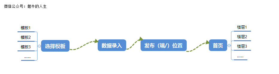 从这四个问题中可以抽象出这么一个工作流程:选择模板》数据录入(》内容审核)》内容发布