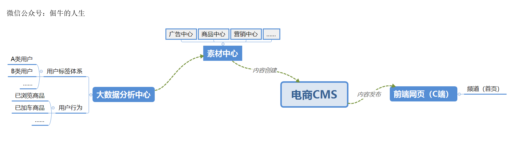 在电商发展初期,没有用户数据积累,用户标签体系(用户画像)没有建立起来的时候,CMS相对简单,内容创建靠运营手工填入、手动发布;而在当下,像京东、淘宝这种大型电商平台,我估计CMS应该对接了素材中心(后台商品中心、营销中心、广告中心等)、大数据分析中心(用户标签体系、用户行为数据等 [会员中心]),通过CMS与素材、数据中心连接就能实现自动生成前台频道等页面,做到千人千面,让不同类型的用户看到不同内容的首页。