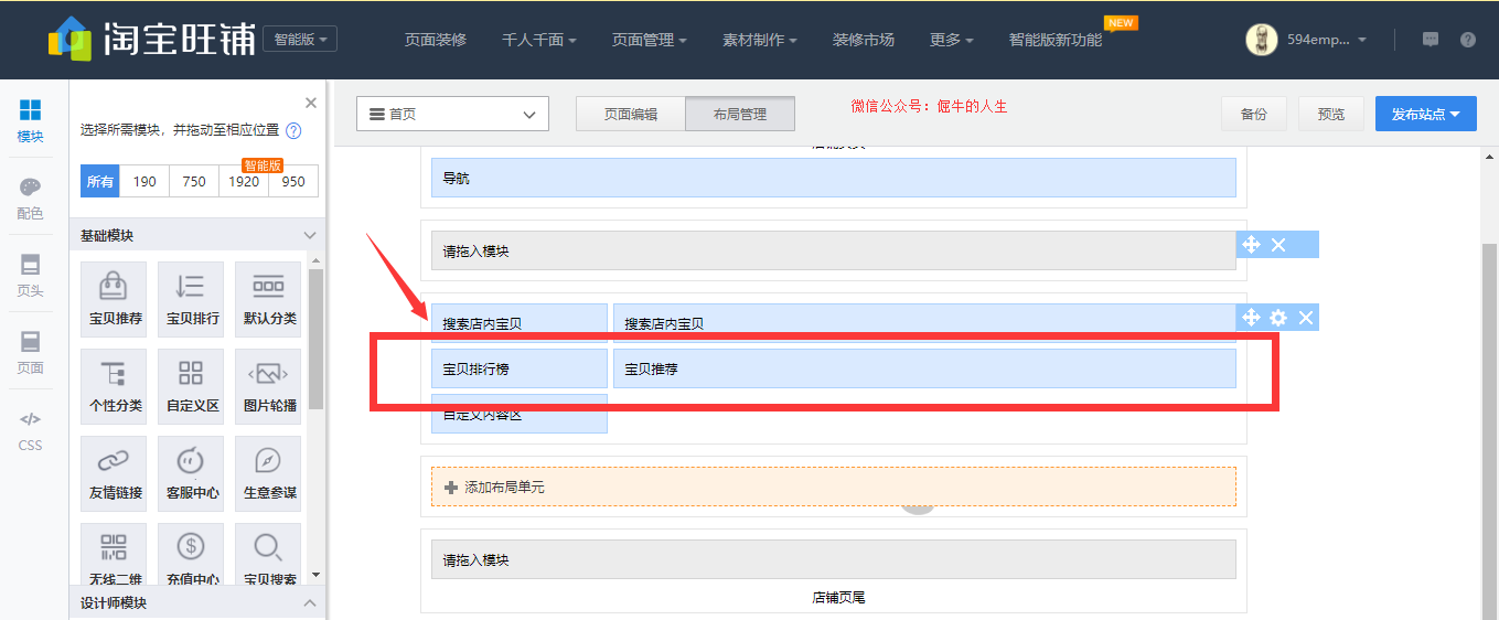 淘宝店铺装修(它是一个典型的电商CMS)就强调了位置这个概念,可以看看下图红框强调的部分: