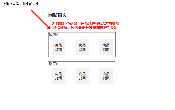 整站分类列表在我看来是一个挂件,它一般悬浮在轮播图上方(页面左侧)。我们绕过这些写死的页头、页尾以及挂件一般的分类列表,现在只说楼层这一部分。接下来,假设把首页简化成是由多个楼层构成,首页动态化配置逻辑大致如下所示: