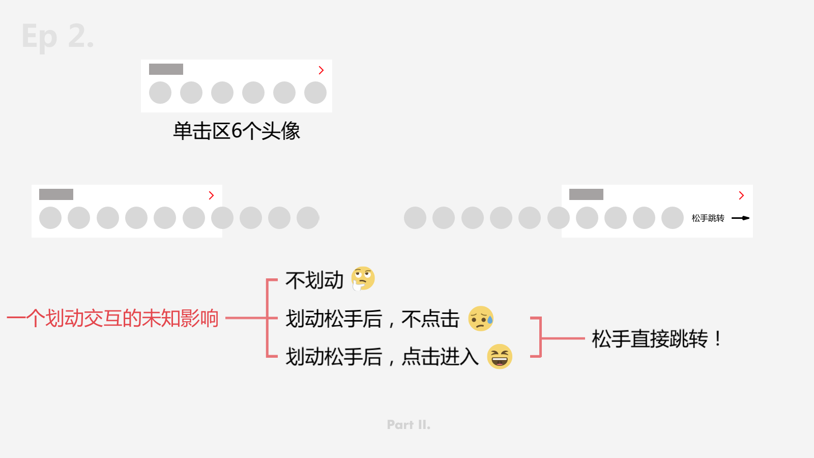 因为主要是这样的改动会带来一个未知的泳道横划交互,它会产生一定的影响,如下图所示:用户看到这个泳道之后可能出现三种行为。