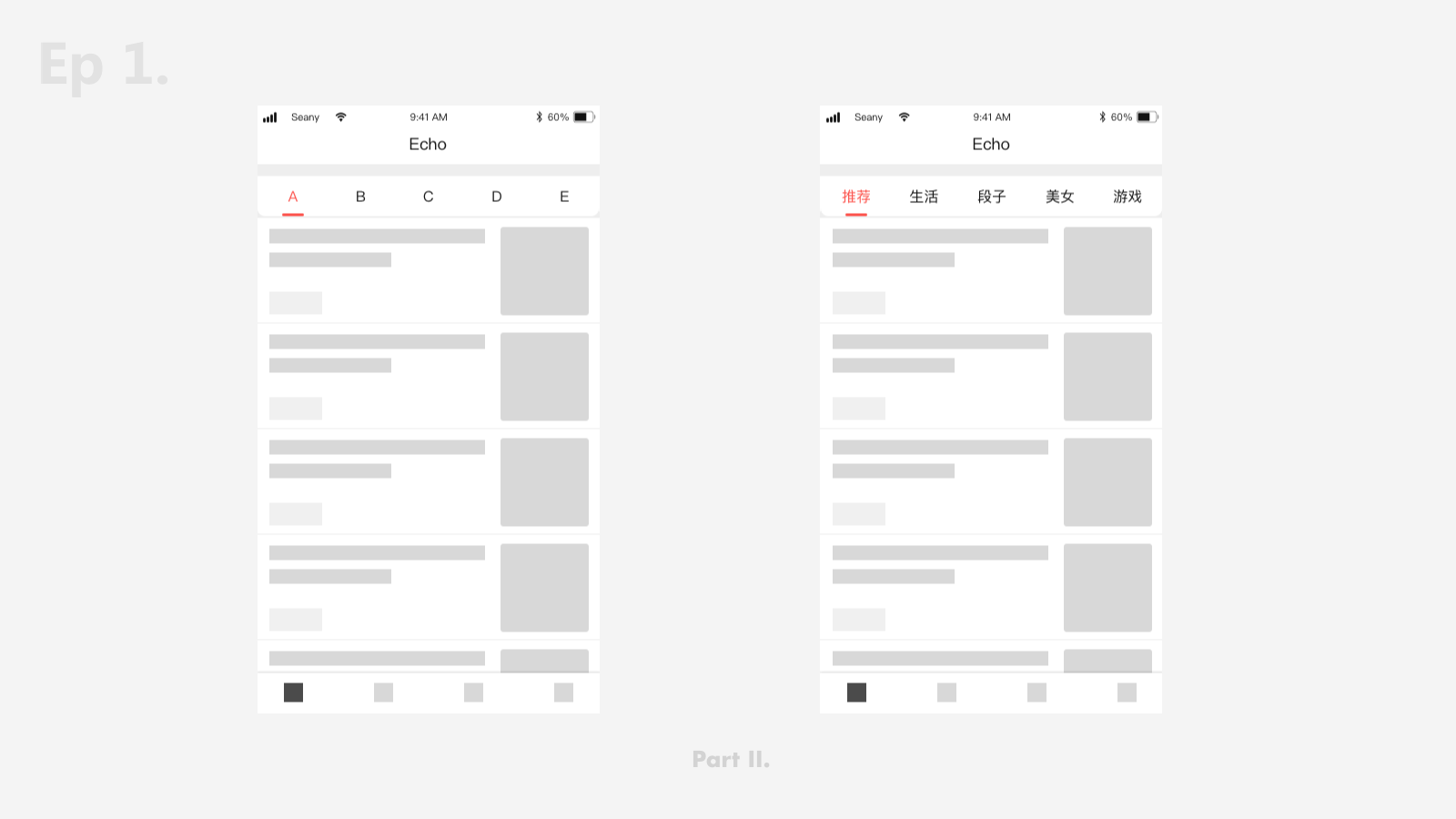 这两个UI模块摆在大家面前,大家应该能清晰的感受到,左边是一个segment控制下面内容的UI;而右边是一个所有内容列表的集合页,只不过通过tab聚类了而已。