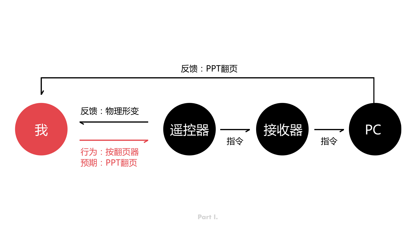 这时候遥控器接收到按钮指令,把指令通过红外线传输到USB接收器上,接收器把指令传到PC端然后完成翻页动作,再通过大屏幕传到我的眼(输入端)中,我就可以确认这一次交互反馈是符合预期的。