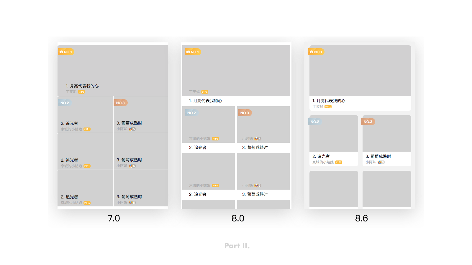 这里举一个唱吧的例子:唱吧从7.0到8.6之间做了三次改版,大家可以看到,唱吧团队几乎是损失了屏幕效率来加大了间隔和突出了歌名,这是为什么呢?