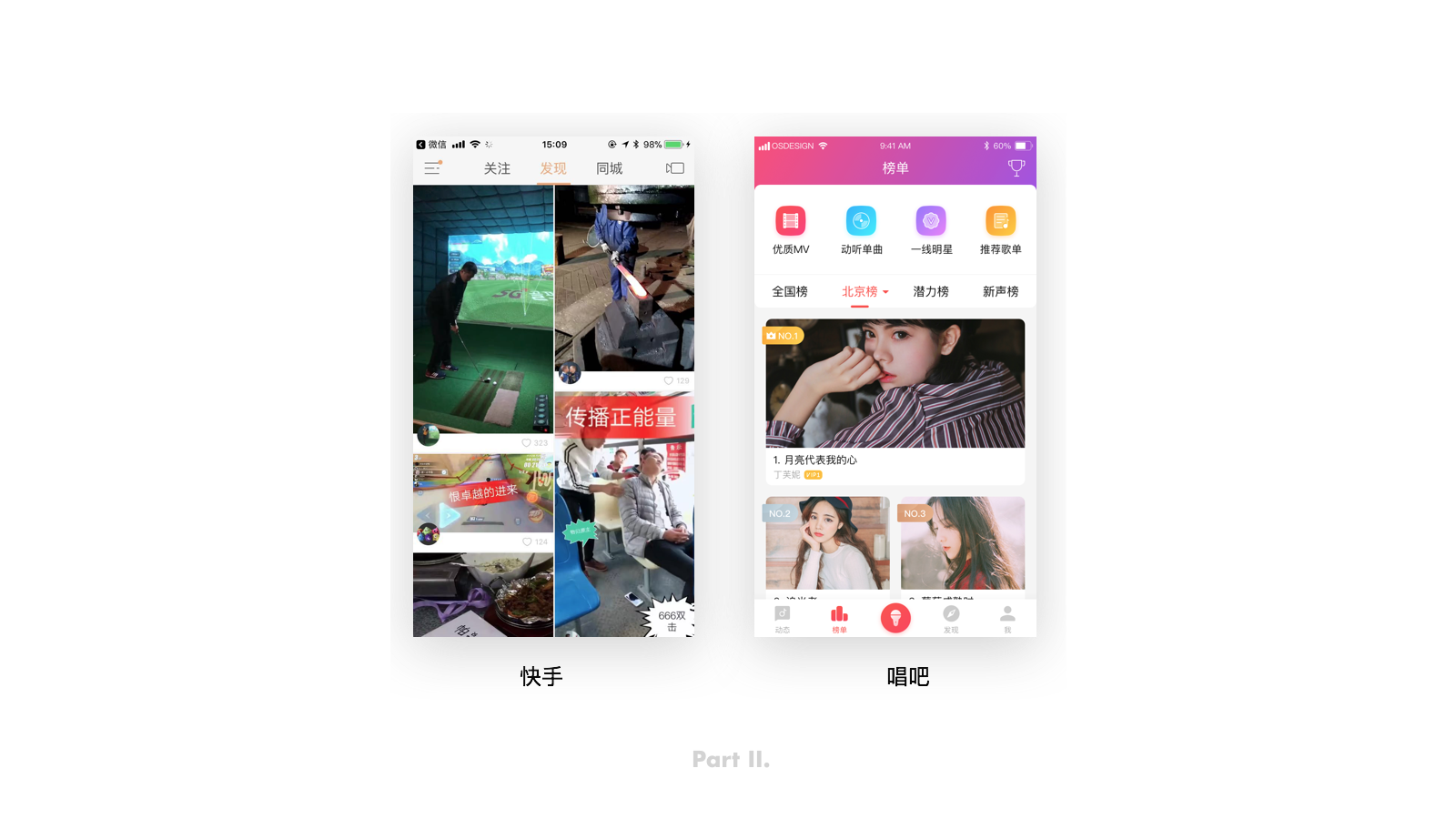 大家会发现:其实这个页面,快手和唱吧承载的内容都是消费转化,都希望用户点击进去消费内容,但是两款产品做了截然不同的UI风格,原因是什么呢?