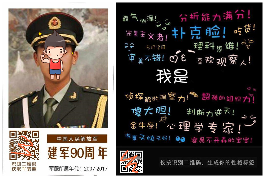 最近刚刚刷屏的“我的军装照”,是人民时报客户端做的致敬“八一建军节”的一个H5页面,迅速走红朋友圈,浏览量破10亿,卓识吸引了眼球。每个人都能通过上传自己的照片,生成了多种军装照的合成照片,效果好并且男生英俊女生帅气,引起了网友的疯狂转发。这是在特殊的情境下,通过激发爱国之心和展示自己的意愿,从而引发的“病毒式传播”。另一款“性格标签”的软件,以比较小清新的风格,和网友认为确实非常准的描述为优势,迅速占领朋友圈,甚至最后微信出手,以“诱导分享”为名,封号7天,可见传播势头之猛烈。