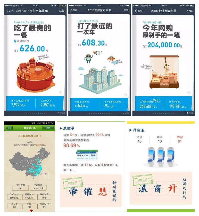 游戏天生有着分享炫耀的基因,但不代表只有游戏能够做到。每到年底,一些产品就会推出用户一些总结数据,如支付宝的全年账单,从多个方位,总结一年的开销,你总能找到一点你比别人超出好多的部分进行炫耀分享。还有纵横航旅的年度飞行地图,展示你全年所有航线,总里程数,航班数等等,通过分享炫耀自己出差多特别忙,或是时间多常旅游等等。这些功能的定位正式用户想要炫耀分享的心里,无需多说,用户自然会分享出去。