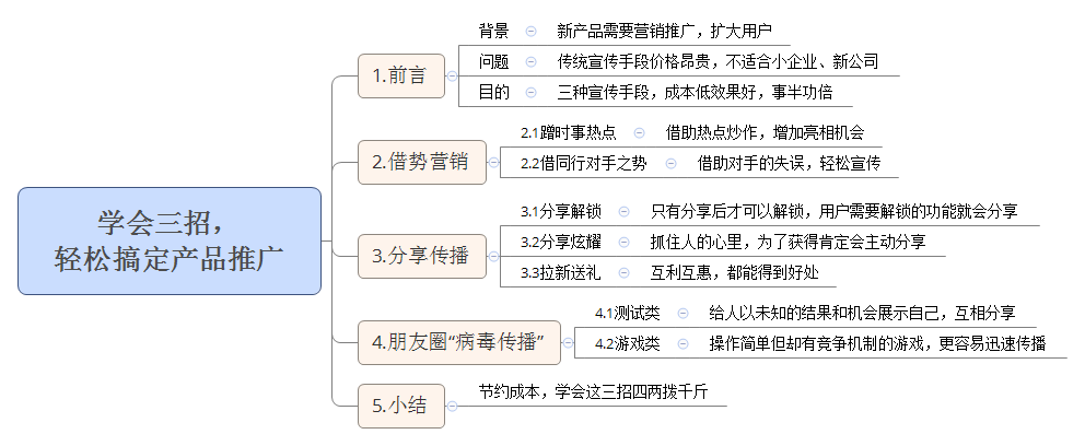 粗略的总结,案例如果不够丰富还请见谅。以上三种是比较具有代表性的方法,效果显著并且成本不高,只要巧妙使用,就会借助互联网的势,迅速扩散。当下宣传的渠道有很多,但价格高昂普通公司和新产品团队无力承担。与其将资金用在烧钱上,不如节省下来打磨产品,因此一定要学会这三招,方能四两拨千斤。