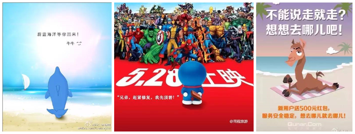 曾经著名的携程宕机事件,由于携程公共迟缓,系统恢复又慢,一时间网络上各种声音不断,同行竞争对手当然不会这个机会。途牛因为和携程的战略合作关系,用了比较卖萌的方式:蔚蓝海洋等你回来。而竞争对手去哪儿则没有这么客气了,赤裸裸的调侃。但在众多文案中,笔者最欣赏的还是同程的小编,巧妙的借用了机器猫的海报,真是一炮双响,不但不得罪人,还显得格外有情有义:兄弟,赶紧修复,我先顶着!
