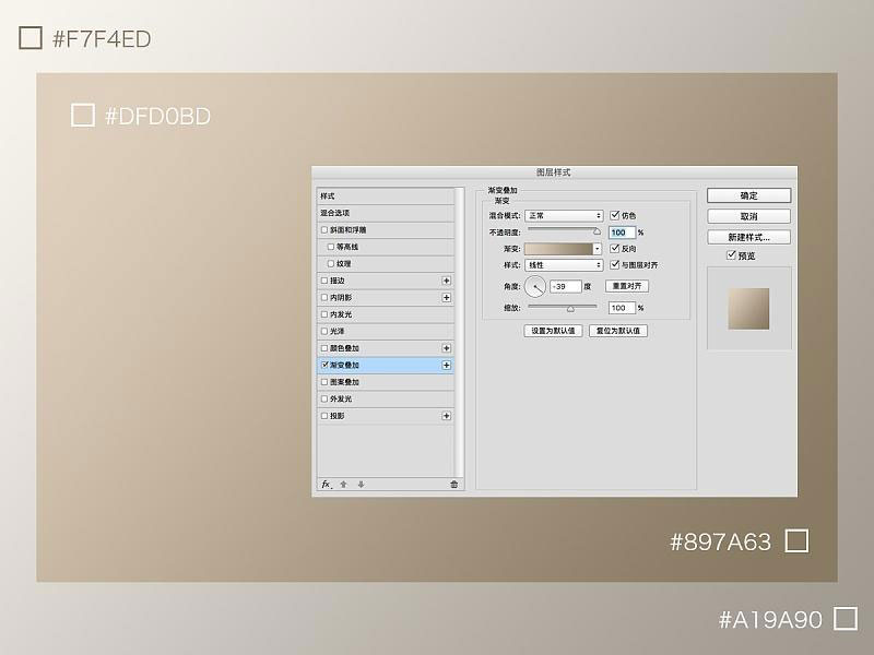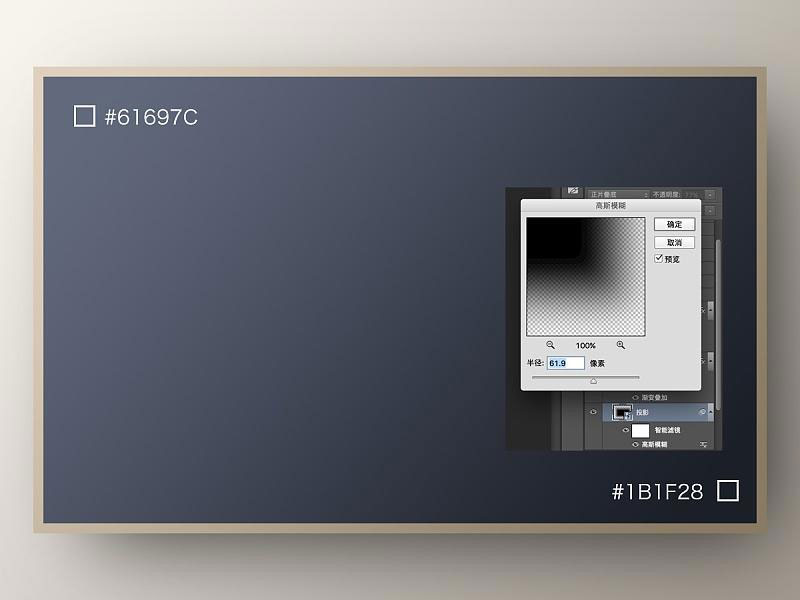 建立画布1200x900px(Mac 2倍)。矩形工具绘制背景和主体框架1100x700px(Mac 2倍),渐变叠加加上颜色,光线方向统一。(渐变是为了模拟背景的质感和在光线下的变化,两层光线方向需要统一;背景颜色稍浅且饱和度低,符合远近的视觉规律)