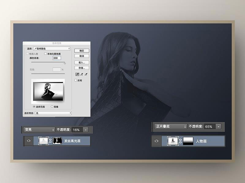 2. 复制人物层,取消图层模式和透明度。 用选择颜色提取发丝高光,添加蒙版抹去不需要的高光,图层模式改为变亮模式,调整透明度使其融合进人物。(单纯的人物正片叠底太平了,所以需要丰富细节)。