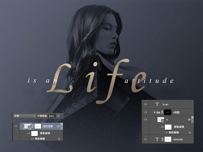 2. 表现文字穿插关系,让“is an”悬浮于“L”上,并留下近距离投影。让“attitude穿过“e”字,遮挡部分文字。