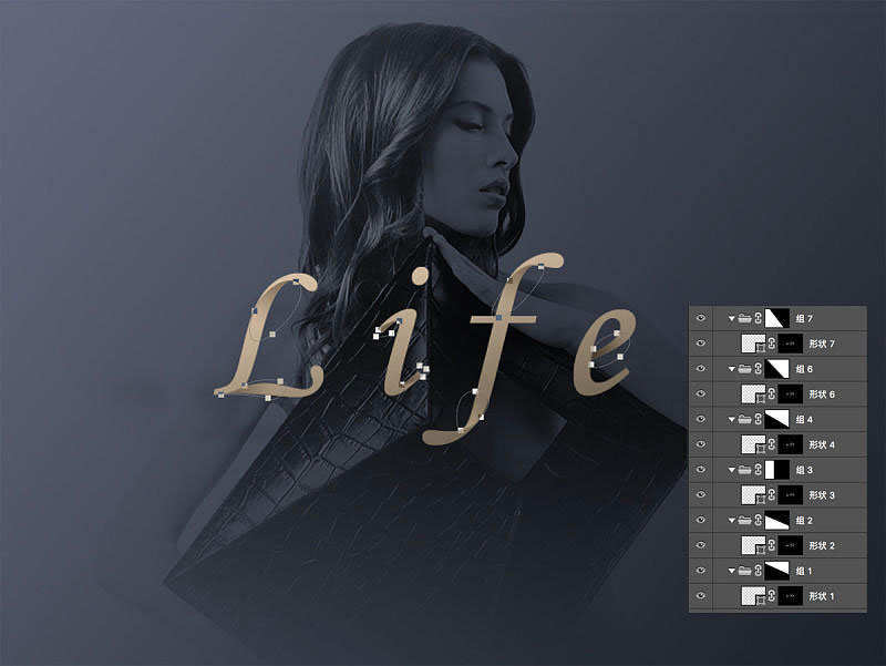 根据字体的结构,用形状工具绘制出字体的立体关系。每一个形状图层绘制后需要两层蒙版,一层为了限制字体范围,一层为渐变蒙版。让文字立体感悬浮与画面中央,提升视觉中心的细节品质。