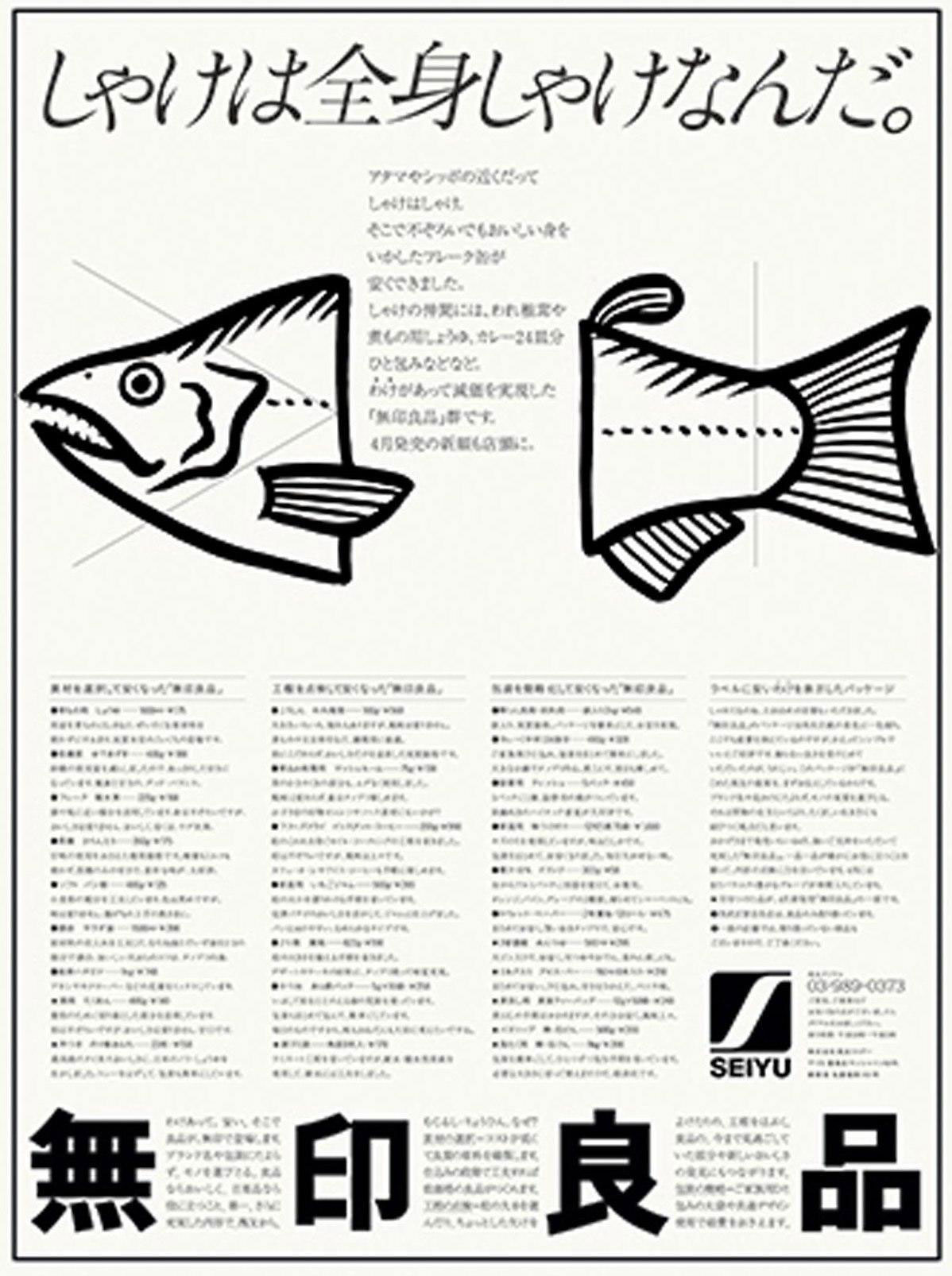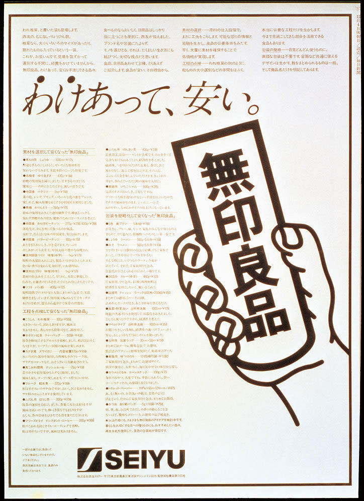 最初的文字广告排版与报纸合二为一,渐渐发展成今天我们见到的设计作品,看到无印良品这样一个广告发展历程,是非常幸运的。与此同时,我们也在一些海报上看到了早期西友百货的影子——这是个大商场,世界第2大零售集团。