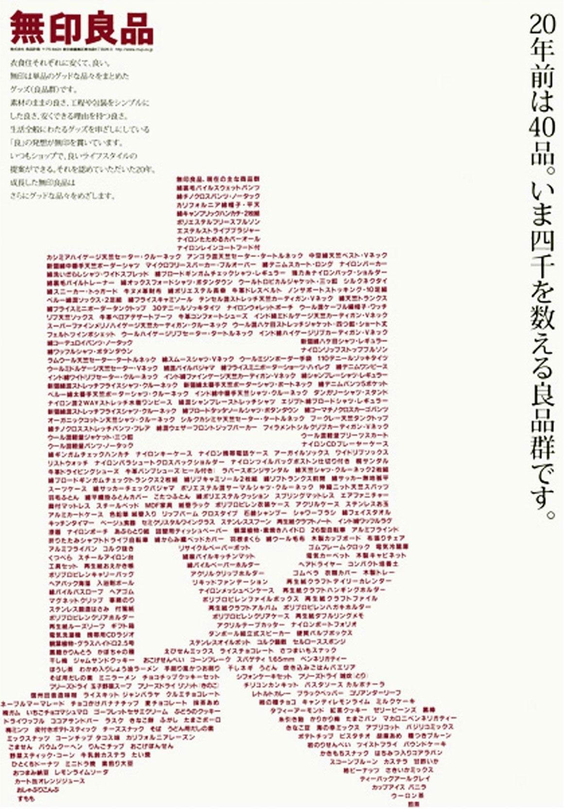 无印良品1980年的第一则纸媒广告:便宜是有原因的。这则广告罗列了40个商品及其原因。
