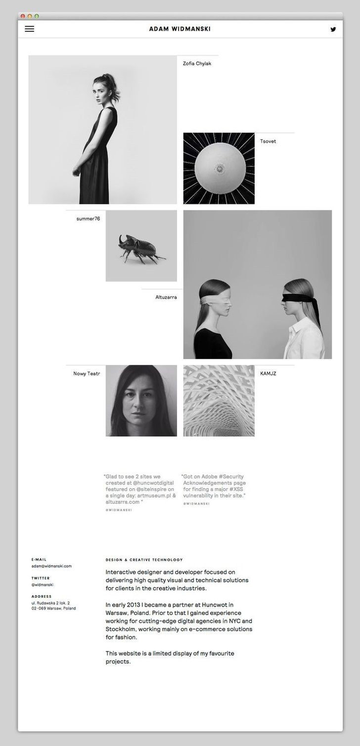 想要建立一个干净、复杂的网站?考虑回到基础,并尝试使用黑白单色设计,如这个例子中所做的那样。通过将界面和图像颜色方案限制为黑白,并将其与最小且良好对齐的布局进行配对,从而创建了一个更干净、内聚和统一的设计。