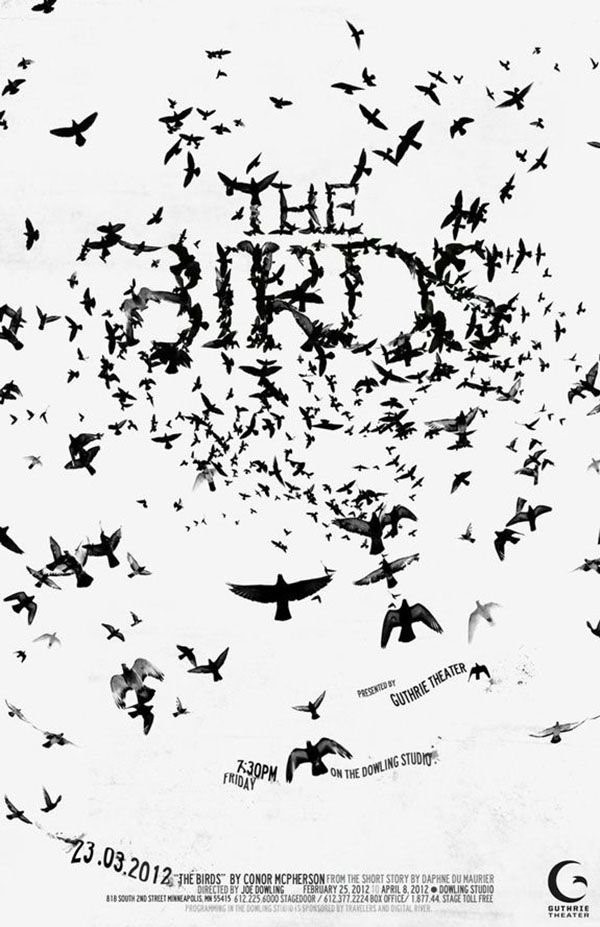 这部电影海报模糊了插图和文字之间的界限,通过构建醒目的黑色小鸟剪影标题,与白色背景形成标题文字使用聚类元素和径向构图将注意力吸引到标题,然后向外部信息靠拢,聪明地使这种单色设计不仅酷,而且具有功能性。