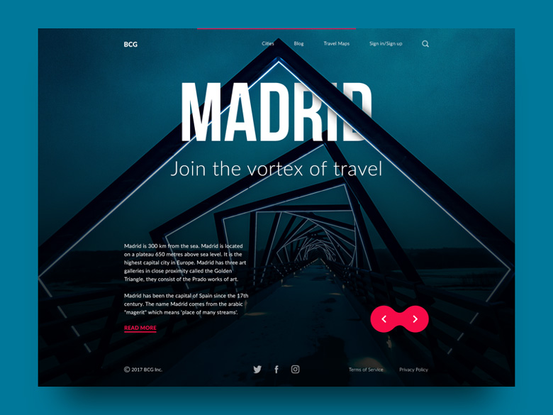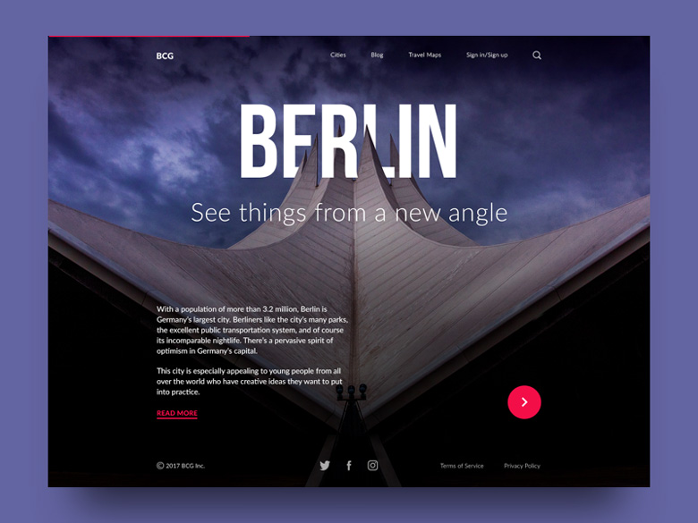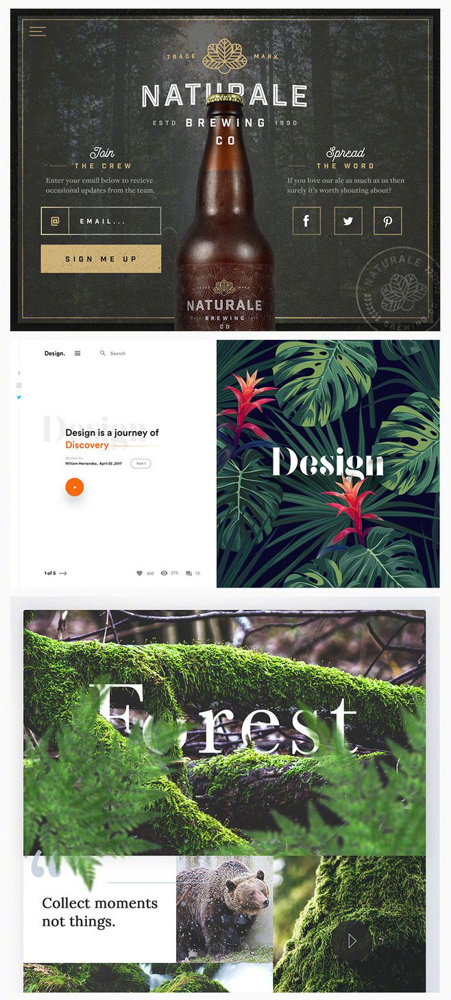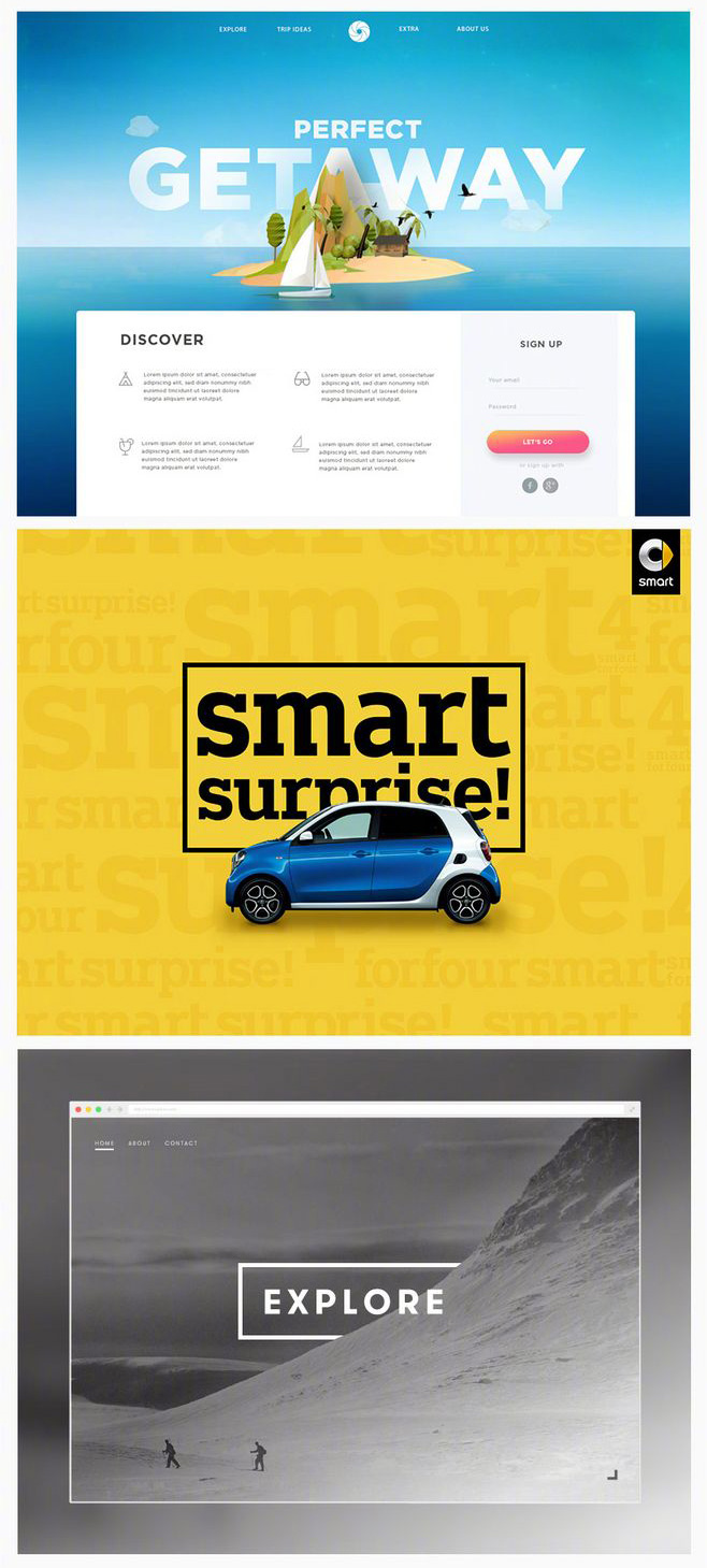 不知道你们是否有同感,我看到下面这三幅作品,瞬间被吸引住了。第一个网站设计,干净辽阔的海洋天空,天水之间的广告词被一些美丽的风景遮住了一部分,但是并没有影响阅读主题,这种犹抱琵琶半遮面的效果反而更加有神秘感!第二张作品是汽车故意遮挡了一点点文字,第三张则是用山脉跟按钮融合,把explore探险遮住一点点,若隐若现符合主题,非常棒!