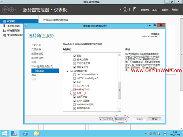 确保CGI被选中,其他的角色服务根据需要选择,如果不知道如何选择,建议选择全部功能。