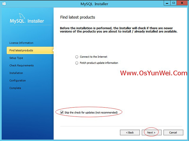 选中“Skip the check for update (not recommended)”(跳过检查更新),点Next