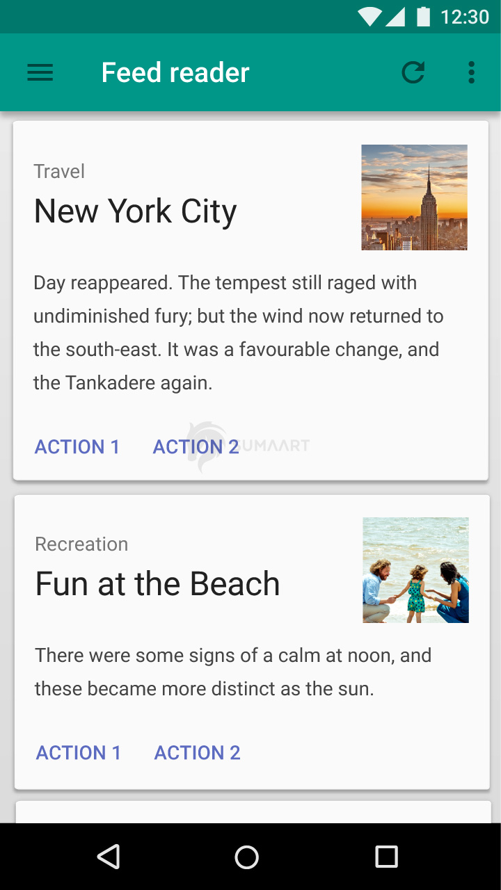 UI中的卡片借用了现实世界中的卡片的特征和概念。通常UI中的卡片是矩形的,其中承载图像、文本、链接、按钮等不同元素。卡片是容器,但是通常一个卡片中会集中承载一种或以一种元素为核心的一小组元素。不同的元素在不同的卡片中各司其职,不同的卡片组合到一起,构成功能性的页面,或者组合。