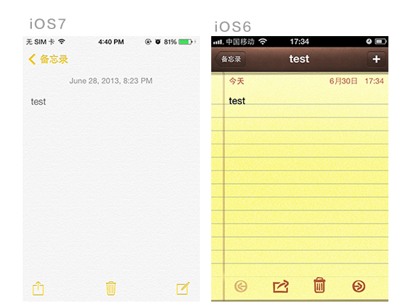 首先,我们看下iOS7上的案例。众所周知,iOS7相对于6设计更加的扁平,去掉了很多质感,保留一些微弱的质感,避免对内容的干扰。这一点遵循了iOS7最新的设计理念,内容优先(Defer to Content),透气(Provide Clarity)。基于内容优先和透气的原则,对之前繁复的UI进行减负,剔除多余元素,有主次的保留,并统一界面里的质感。