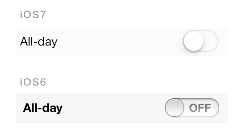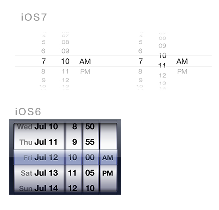 时间设置控件可以很清楚的说明这个问题,新旧两版都是模拟波轮这个物体。只是新版为了更加突出内容,放弃了多余的质感,内容的呈现依然用波轮的方式表现。甚至在你波动波轮时会发现,已选状态上依然保留了玻璃的特性,在边缘会有一个折射效果。由此可以看出,iOS7的简洁还是保留了相当多的拟物细节的。