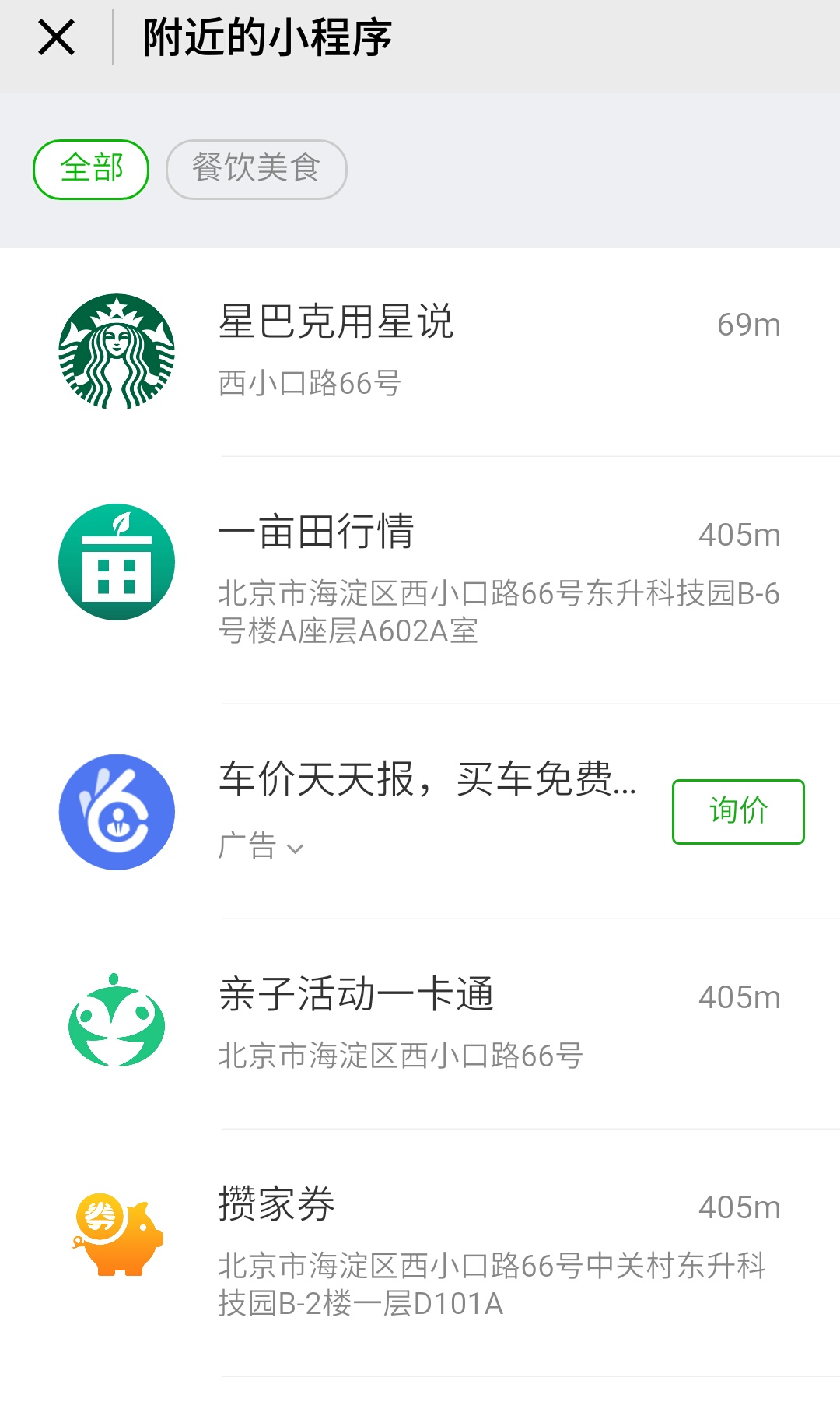 附近的小程序是微信开放的关键流量入口,特别是对餐饮和零售业起着举足轻重的作用。同样,附近的小程序也新增了广告投放渠道,该广告出现在附近小程序的第三行,点击即可以打开对应的小程序。