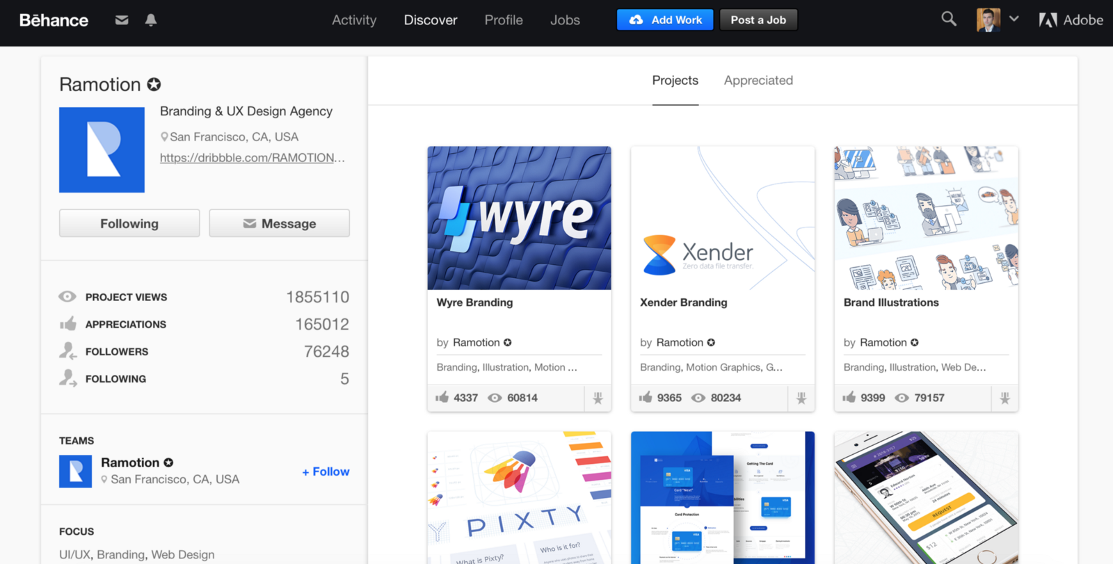 Behance 是目前最有影响力的设计师作品展示平台,许多公司都将它作为重要的参考。我最喜欢的是 Ramotion 的作品集,他们的每一个作品几乎都是精品,并且受到业界极大的关注。