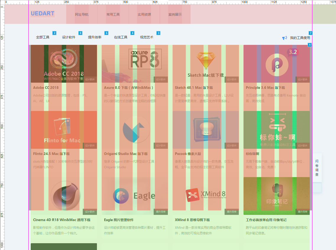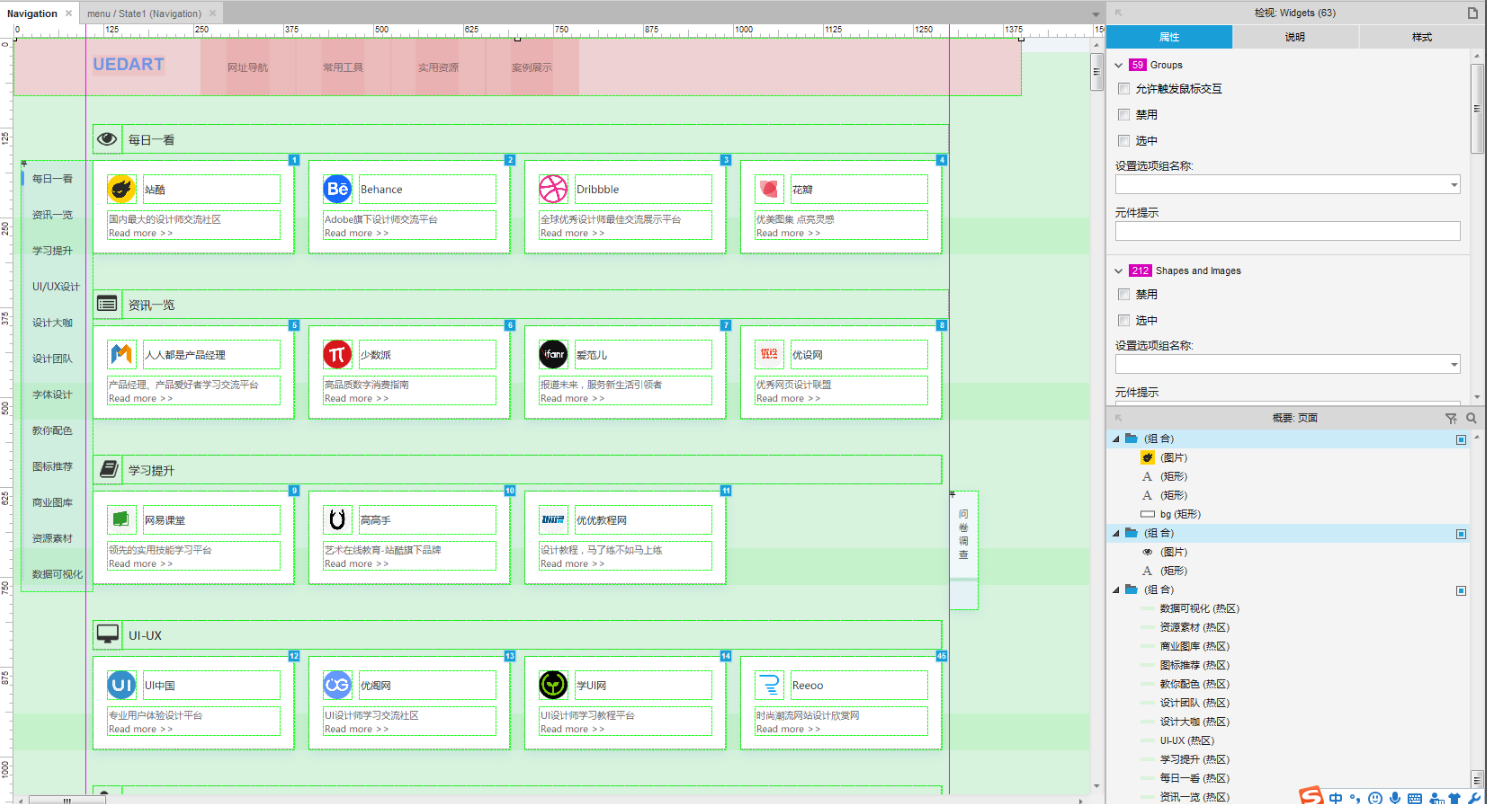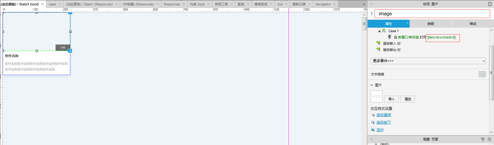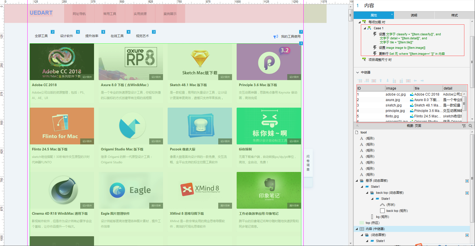 常用工具与实用资源页面,采用了中继器来制作,在中继器的微型数据表中,插入对应字段后,关联每项参数的内容(对元件名称进行命名),以后增加一条数据对应改变其内容即可。