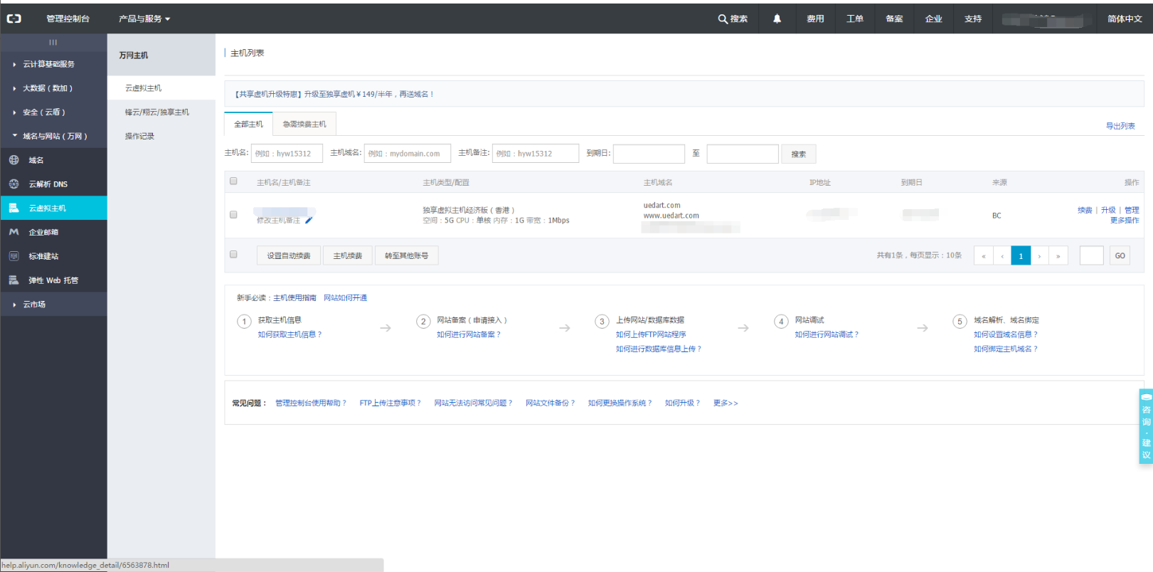 (1)我们需要一个域名,可以到阿里云万网去购买https://wanwang.aliyun.com/,我选择的域名是uedart.com的域名;