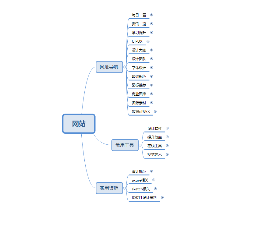 包含以下主要内容:网址导航、常用工具、实用资源、案例展示,通过思维导出对其内容进行