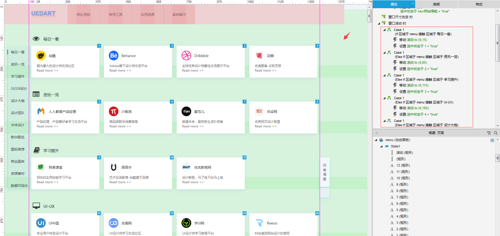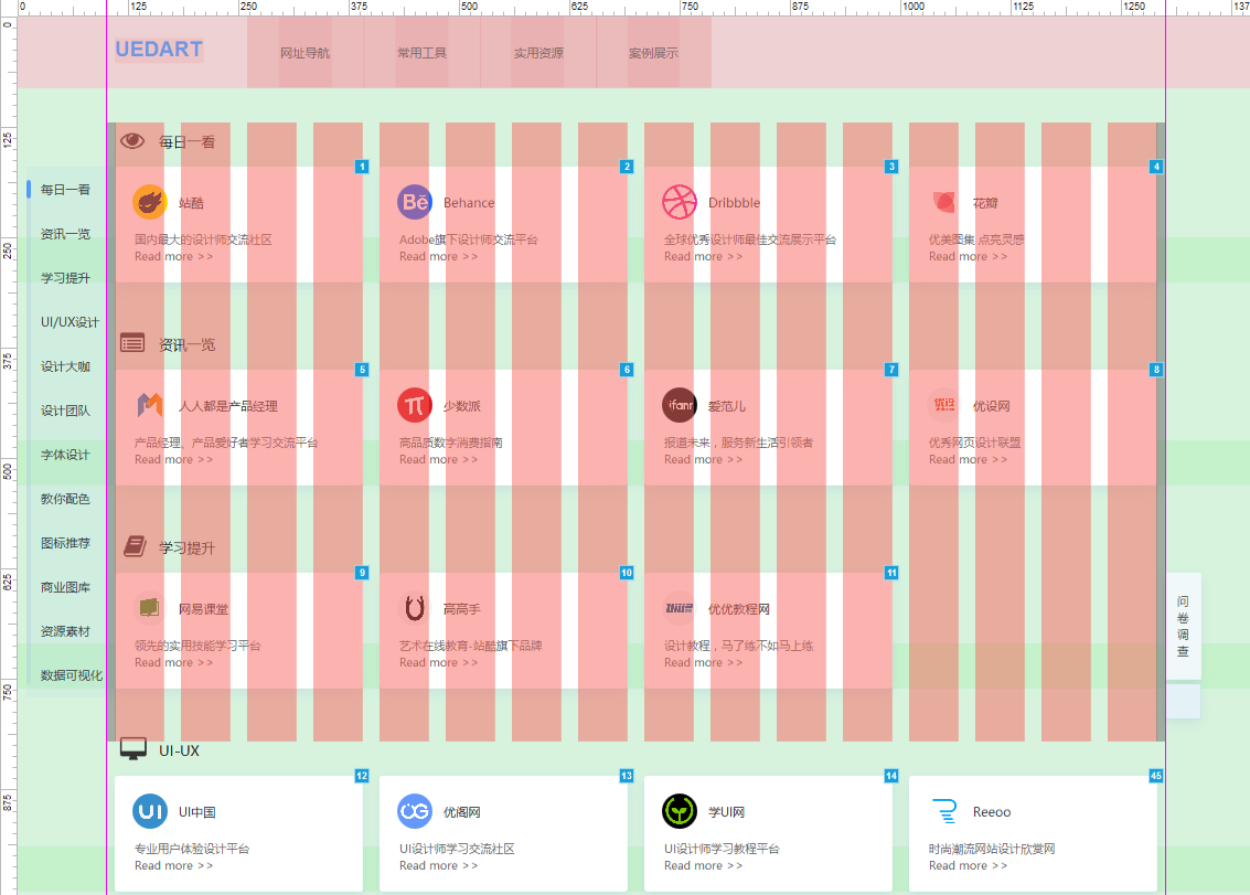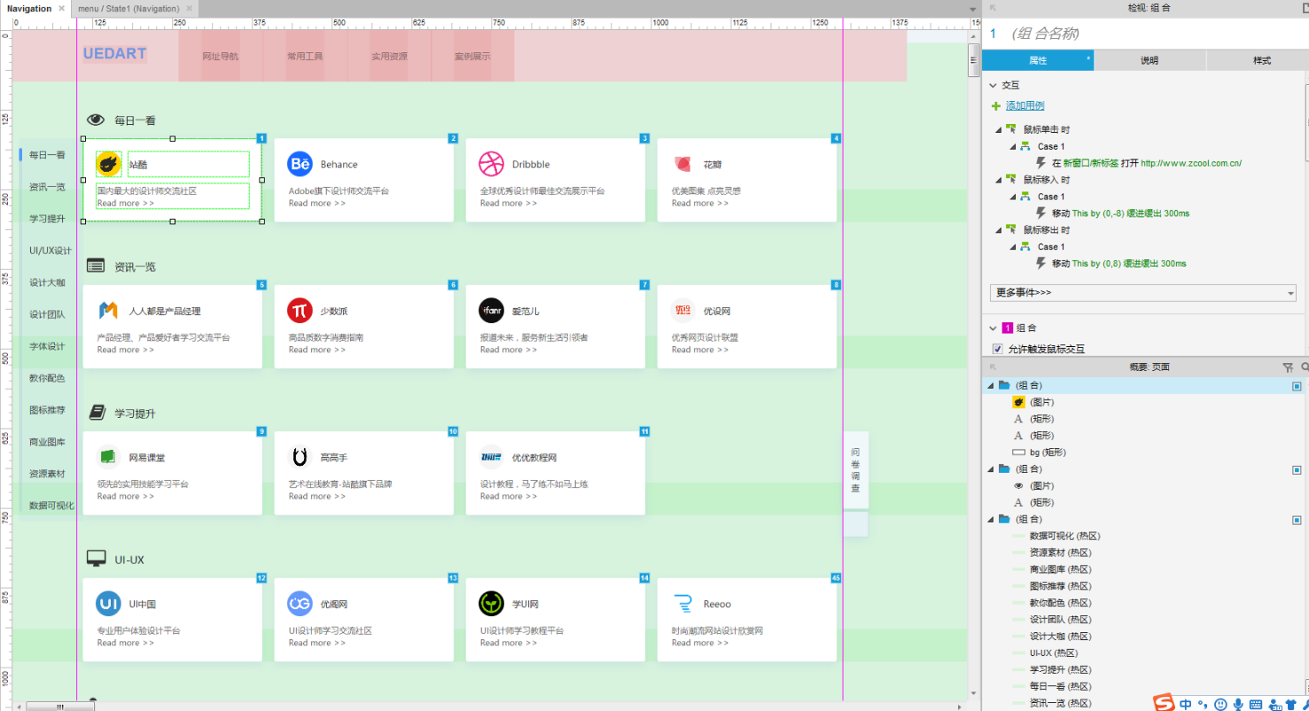拿网址导航页做示例,每个单元模块标题,网址卡片、左侧导航的排布尽可能规范统一,立马包含了各种元素的基本规范如:字体大小、颜色、宽度、悬停交互效果点击跳转效果
