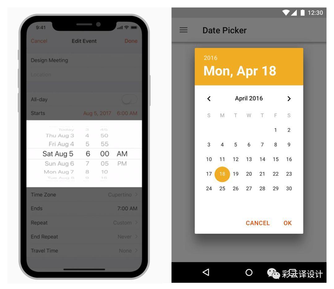两个平台差异的一个例子是日期选择器。安卓用户对iOS中常见的老虎机形式的日期选择器并不熟悉。在Android中使用这种类型的日期选择器还需要重新布局,这样无形中增加了开发的难度和时间,并使界面看起来与系统风格格格不入。