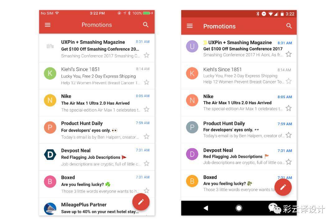 当然也有例外:一些iOS应用遵循Android设计规范(比如Gmail)而一些Android应用则遵循iOS设计规范(比如Instagram)。
