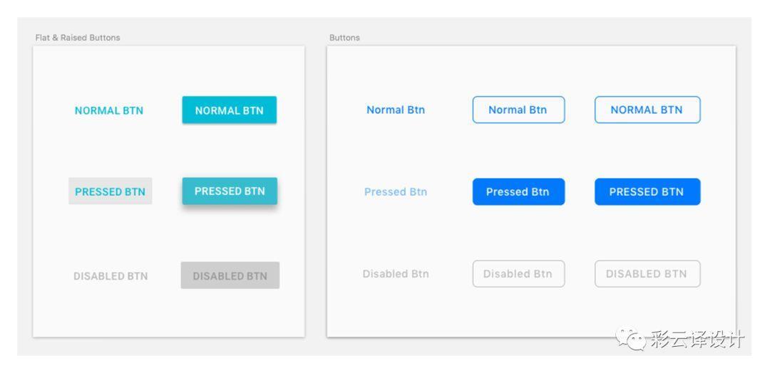 在Android设计规范中有2种不同样式的按钮——扁平的和凸起的。这些按钮分别用在不同的场景下。在Android中,按钮上的文字一般都是全大写。在iOS原生应用的按钮中有时也能找到大写的文字,但更多的情况是出现在标题上。