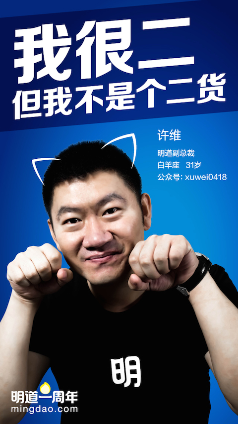 趣味性是最容易获得传播的一种内容。以我最近策划的明道周年活动为例,传得最火的就是我这张卖萌的“二照”,因为大家觉得很好玩,一个平时看起来那么正经的人,卖起萌来竟然也能那么无节操,所以就纷纷转发了。