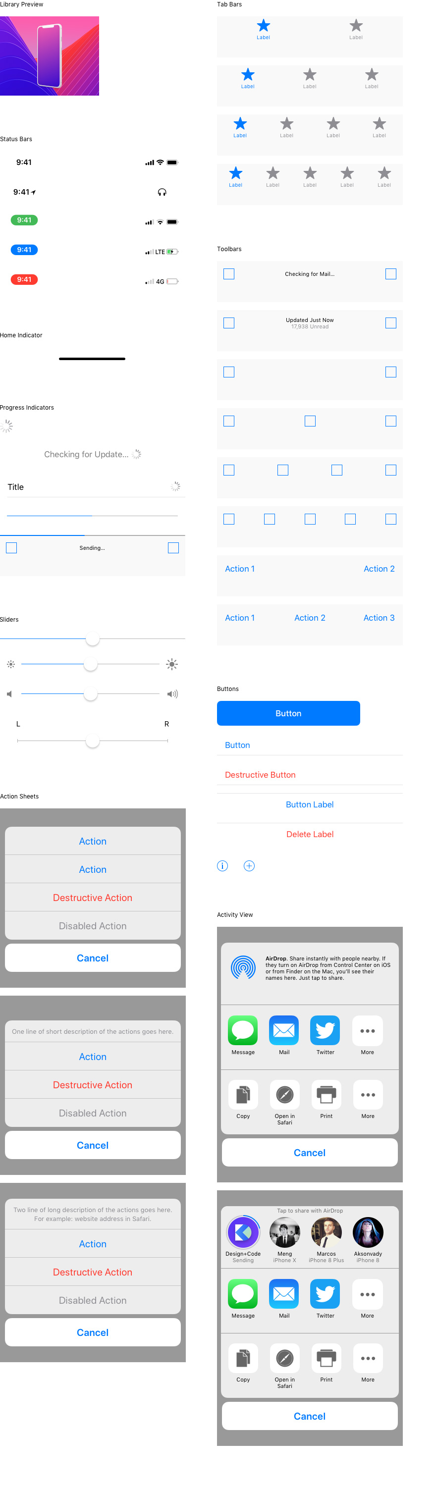 本文虽简短但对于手机ui设计师来说足够实用!最全最新的iOS11 UI工具包(sketch矢量文件)在这里都有了!包含了所有的组件、布局和排版、图标icon等。看起来像是一整套前端切图的皮肤似的!这一整套ui界面元素均根据苹果的人机界面指南制作的。每个组件的命名规则严格遵循苹果开发人员同样的文档格式。整个UI工具箱是用iOS 11-类型的大小设计的,系统字体在iOS等。对于不同的屏幕尺寸,所有元素都可以很容易地调整到任何宽度或高度。