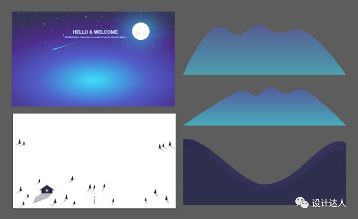 每一组插画都很有特色,特别是都运用了渐变过渡绘制风格,这样的 BANNER 最适合在网页设计或 UI 启动屏上使用了!