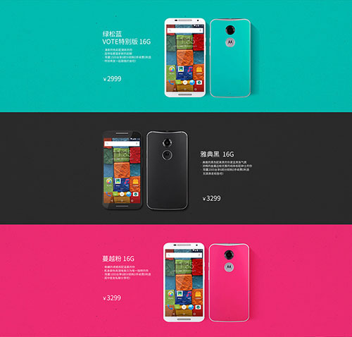 上面的图是Motox的网页设计,页面的主色调(背景色)使用了手机背壳的颜色,这样可以强调商品色彩,给购买者留下非常深刻的印象。