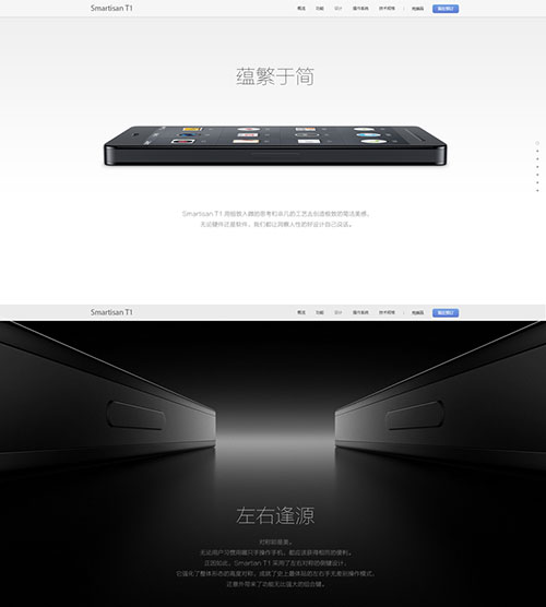 案例为锤子T1的网页设计,虽然好多人都不喜欢老罗,但是我觉得他有对设计特有的一种完美主义的偏执,无论是手机的外型(各种对称)还是系统UI的设计,我觉得作为设计师我还应该多向他学习一下。回到页面设计本身,我们来分析一下这个页面的设计。