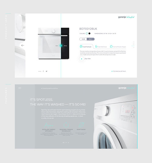 上面的设计是小牛N1和一加3的设计,这两个设计是典型的左右排版。右侧放商品图片,左侧排列简单而有用的基本文案信息。而左右两边的图片和文案信息的大小对比要要根据商品的属性来决定的。例如,一加手机主要体现手机的外型和质感,所以放置2个占比面积较大的手机,搭配最基本的文案信息(只有手机名字、价格和购买按钮)。