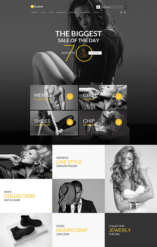 通过提取出的颜色我们可以看到,上面的页面设计中采用了黑白灰做为主色调,使用亮黄色为辅色,虽然亮黄色为辅色,但是人们第一眼往往会注意亮黄色,而设计师把70%off的折扣信息的字体颜色选为亮黄色也是对折扣信息的强调。
