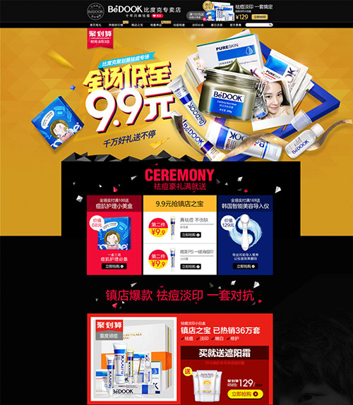 这里我们先不说这个专题设计的构图、颜色,只说一下文字,除了9.9元比较明显的突出了卖点以外,其他基本都非常杂乱,字体的字形被改的面目全非。因此提醒大家,在没有能力把握字形的时候千万不要自行修改甚至设计字体。