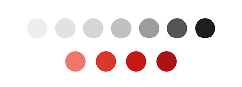 这样我们很容易的就能看出来颜色的层次,灰色系有7个层次,而红色系有4个层次,正因为这样的层次让整个设计显得非常丰富,并且有立体感而不至于太“平”。
