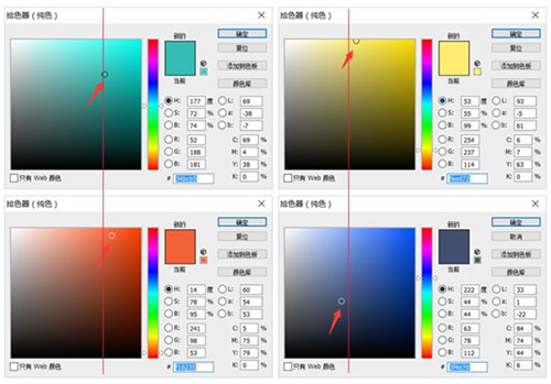 我们来看一下,上面4个圆形中的颜色是我从图片中提取出来的,下面4幅图是颜色的位置和参数,主要看颜色的位置,就是每幅图的圆圈位置,我们看到图中有两条线,这两条线就是代码这4个颜色的明度,可以看到绿色和橘色的明度位置非常相近,黄色和深蓝色的明度位置也很相近,绿色和橘色占整个画面的绝大面积,因此整个画面看起来是非常协调的。而饱和度就是越接近色板的右上角饱和度就越高,我们看到除了深蓝色,其他3种颜色都处于饱和度比较高的位置,并且位置比较靠近。