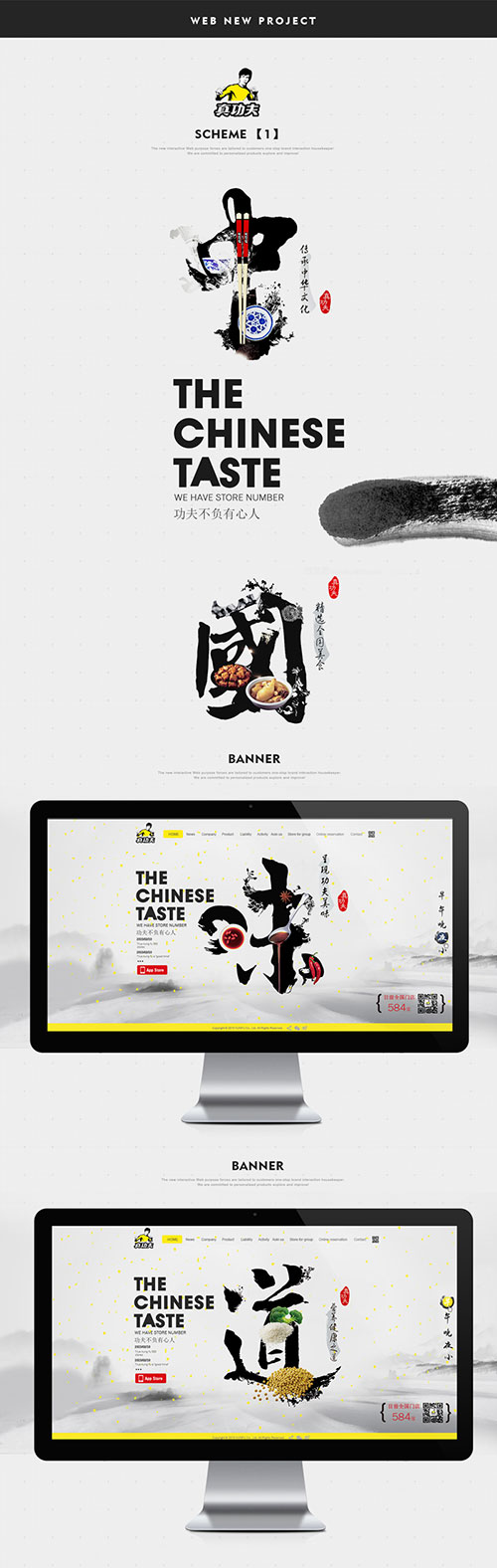 上面的页面是真功夫的设计,很明显,中文的书法字体是做为一种艺术图形来传达和表现的,并且结合一些相关元素(辣椒、调料、蔬菜、粮食等)突出“味道”的主题,并且很容易就能看出是美食类的页面。