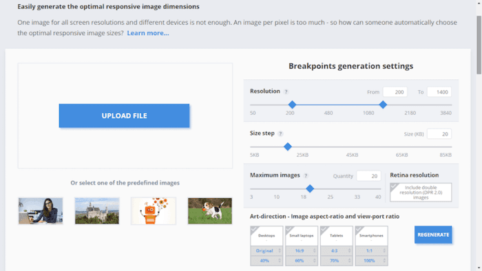 因此,我们该如何自动选择最优的响应式图片尺寸?有望的是,有在线工具能管理整个文件夹的图像的多个尺寸。Cloudinary就是能生成交互式响应式图片断点的工具。这个工具使用了高级算法能为每张上传的图片生成最匹配的断点;在逐个图像的基础上分析图片以找到最佳断点,而不是生成所有可能分辨率的图片。
