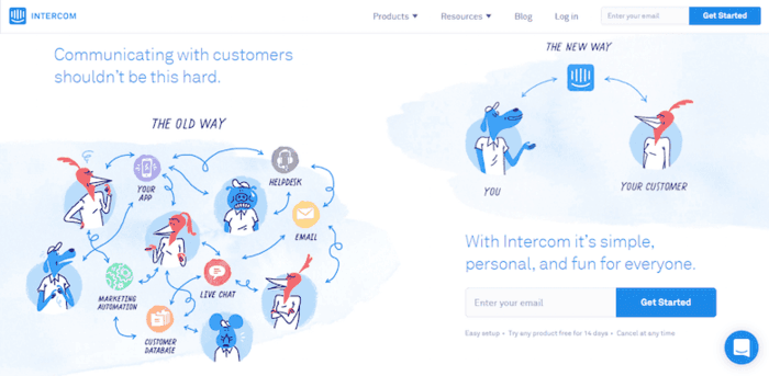 Intercom使用插图来比较旧的工作方式,而不是一个简单的方法。